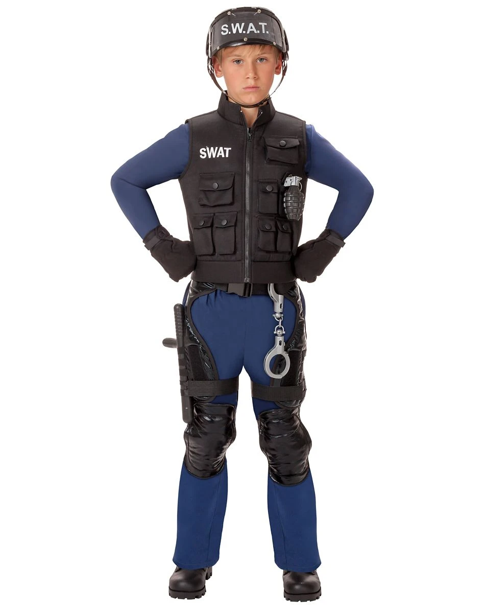 From Our Exclusive Signature Collection. Have your child be prepared for anything when they dress up in this deluxe SWAT costume. Including everything they need to be a member of a SWAT unit, this costume features a high-quality black vest, which accents the dark blue shirt and pants underneath. Whether you’re taking them trick or treating, or just going to an awesome costume party, your child is sure to love this unique occupational costume!