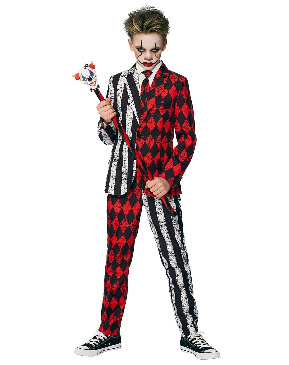 Invite everyone to the twisted circus when you wear this clown party suit! The black, white, and red coloring and mix-matched patterns will let everyone know that you’re ready for some fun! The included jacket, pants and tie will give you a put together look that is unlike the rest!