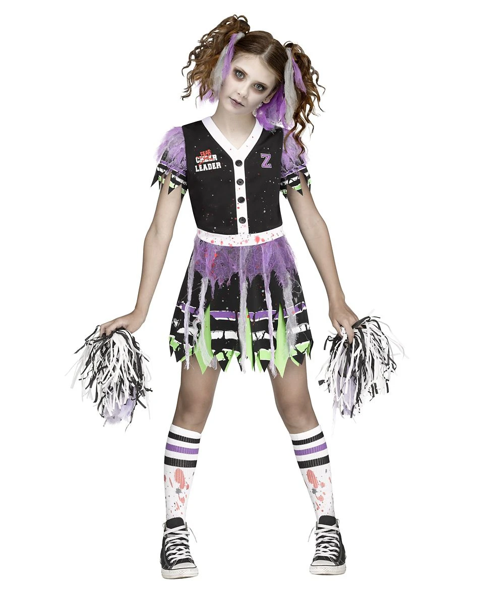 Forget bringing the cheer, bring the fear this Halloween in this freakishly fun costume. This zombie cheerleader is back from the dead and hungry for some football brains. The tattered bloody dress and socks combined with the included pom poms make this frightening look one to cheer for!