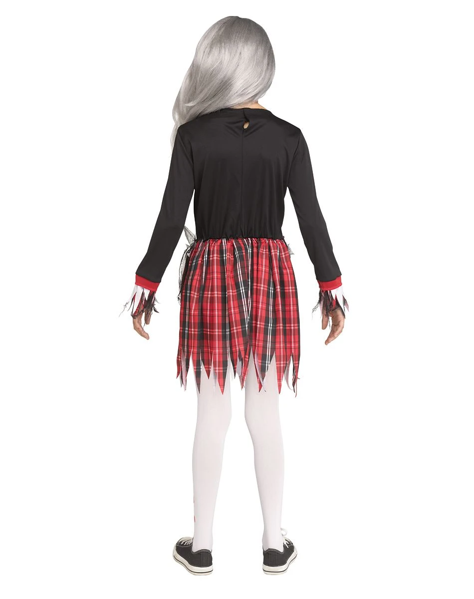 You’ll look ready for your next class at zombie high when you get yourself this Kids Zombie Nerd Costume. Featuring a battered dress, bloody tights, and a headband, you’re sure to get an A in being undead while wearing this zombie nerd costume.Â