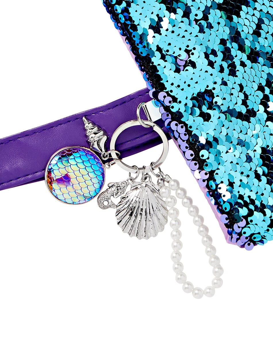 Complete your enchanting mermaid ensemble with this sparkly sequin tote bag! This aquatic accessory features glistening blue-green sequins that reverse to reveal bright purple undersides, a vibrant purple interior, and dangling pearl and seashell accents. Complement your under-the-sea look with this shimmering sequin accessory!
