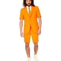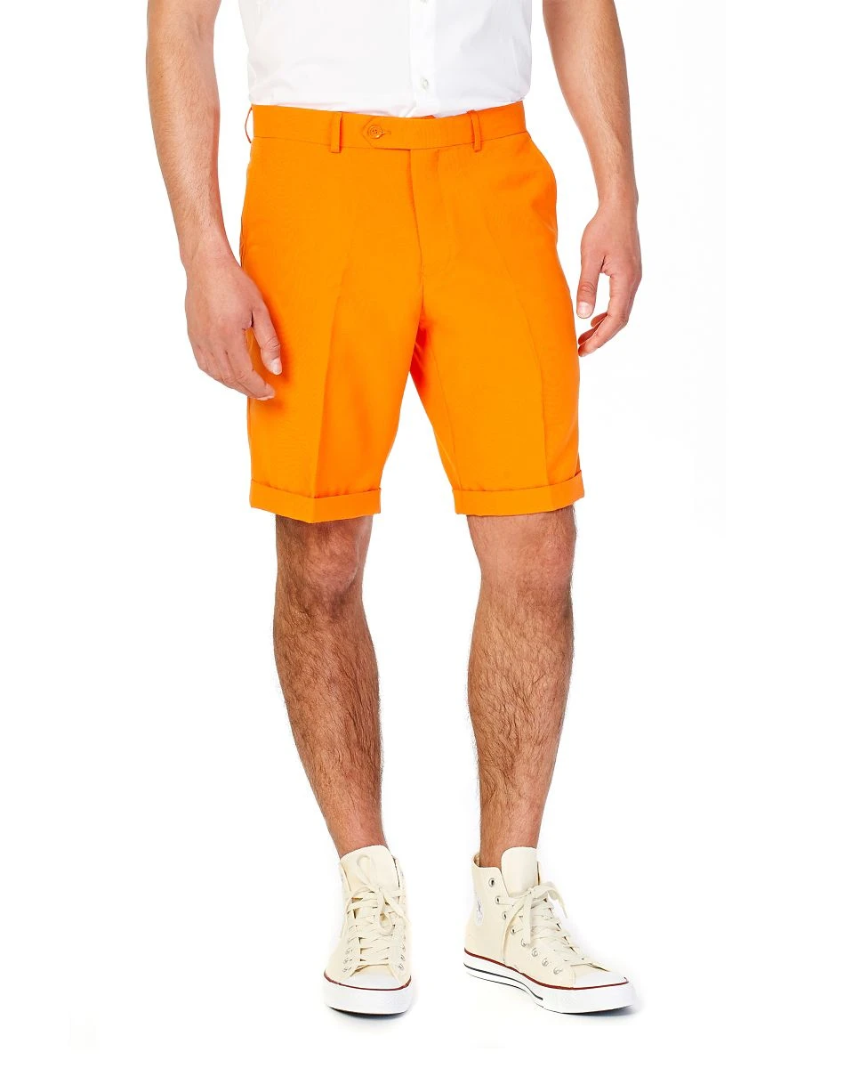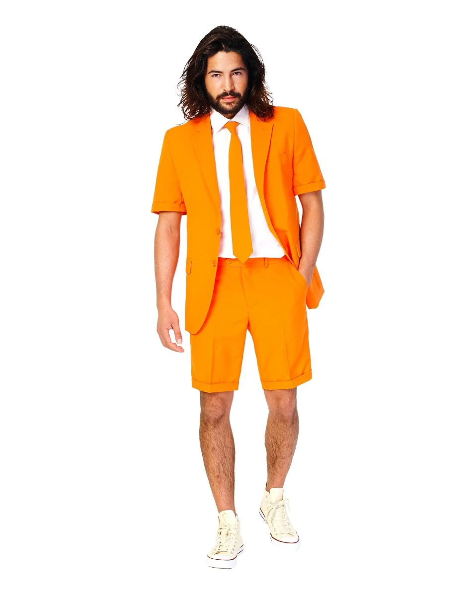 Redefine the term “summertime fine” in the Orange Summer Party Suit! You’ll be everyone’s orange crush in this men’s short suit set which features slim fit short sleeve jacket, shorts and tie all in an eye-catching tangerine. Win at every summer wedding, prom or beach bar in this suit which features high-quality details like belt loops, pockets and a cuffed hem. Pants come with 1.5 inches of extra material at the seam, so they can be perfectly tailored to your body.