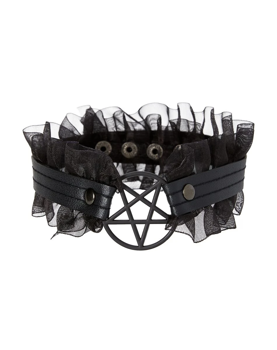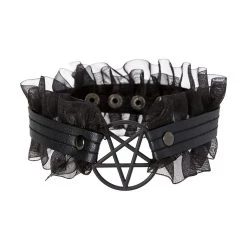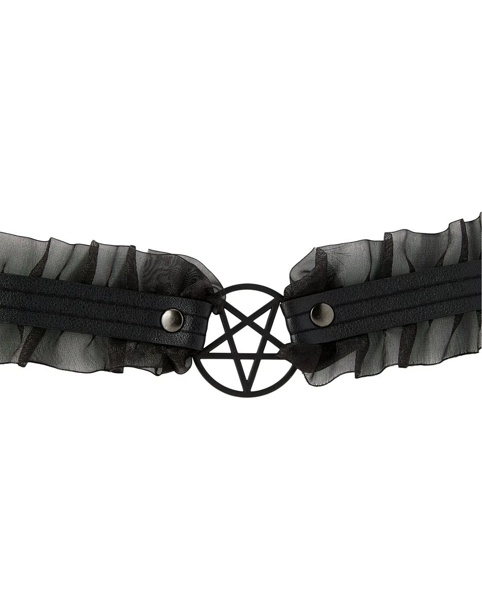 Wear this pentagram choker to show that you’re in touch with your witchy side. This choker necklace features a leather-like strap adorned with sheer ruffles and a black pentagram charm.
