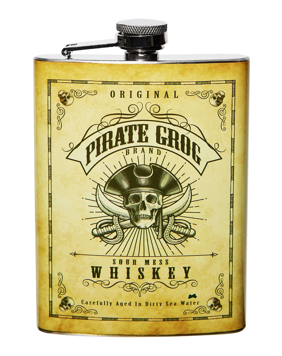 Arrr, ye can’t go to the party without this Pirate Grog Flask! This stainless steel flask features an attached screw-on cap that keeps contents secure even in the roughest seas. Complete your pirate look with this flask!