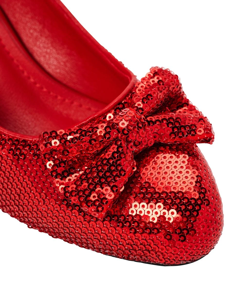 Your Dorothy costume deserves the perfect finishing touch! These sequin-covered ruby red heels feature rounded toes, sweet, sequin-adorned bows, and a 2.5″ block heel. Click these heels together to feel right at home.