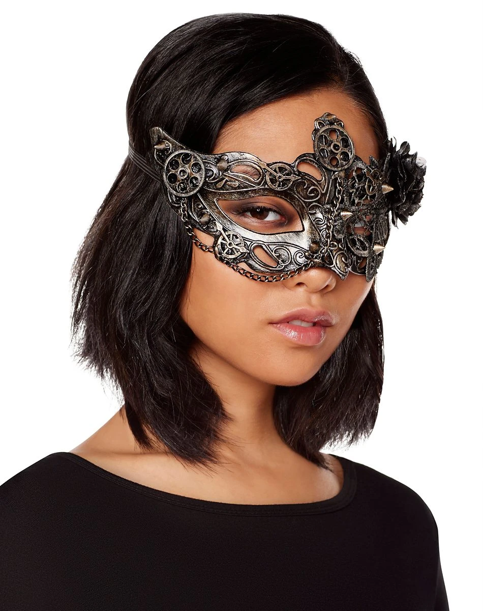 Add this ornate silver eye half mask to your steampunk-inspired costume! Shiny gears, chains, and metallic accents add a hint of mystery to your look.
