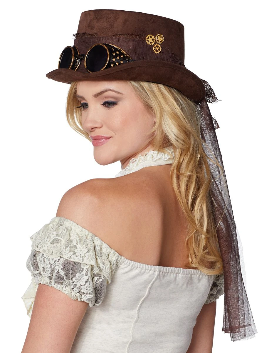 Accent any retrofuturistic style with this steampunk top hat! The included goggles add another layer of vintage fun to this classy geared top hat.