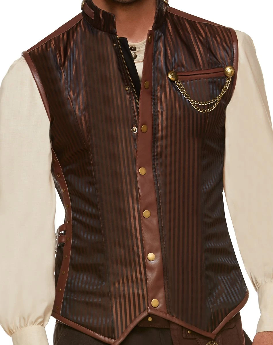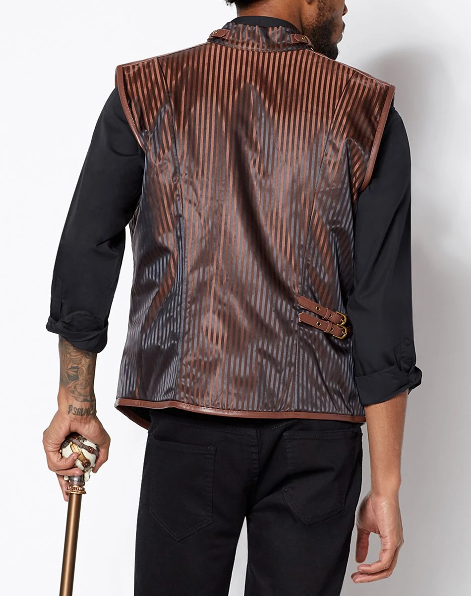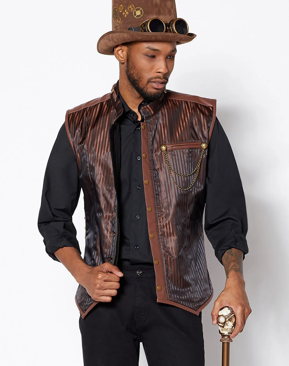 Get ready for the most epic Halloween ever! You’ll bring steampunk to life when you button up this striped steampunk vest! Snap and zipper closure makes for easy dressing. Chain detail at pocket adds a little extra character to this look and will blow away the competition at every party. Buckle detail at the collar and sides is fully functioning and adds dimension you never knew existed! Faux leather shoulders and lining for a sophisticated look that is all your own!