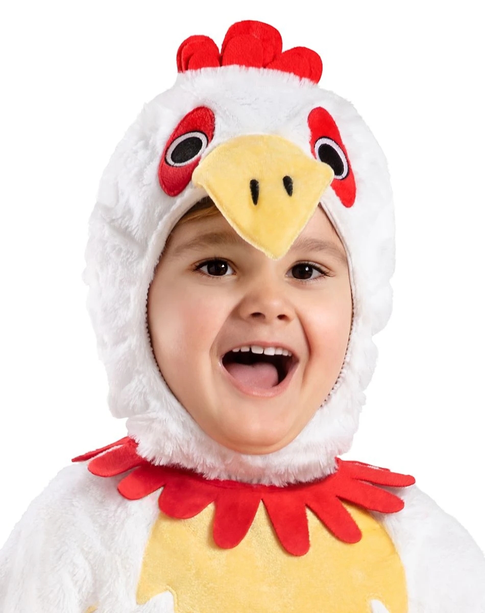 Cluck, cluck! Your toddler will love dressing up in this faux fur chicken costume! This one piece costume features attached detailed foot covers, an attached tail and wing-shaped long sleeves for an authentic look that belongs at the farm! Coming complete with a push-to-start button, this costume also makes clucking and squawking sounds!