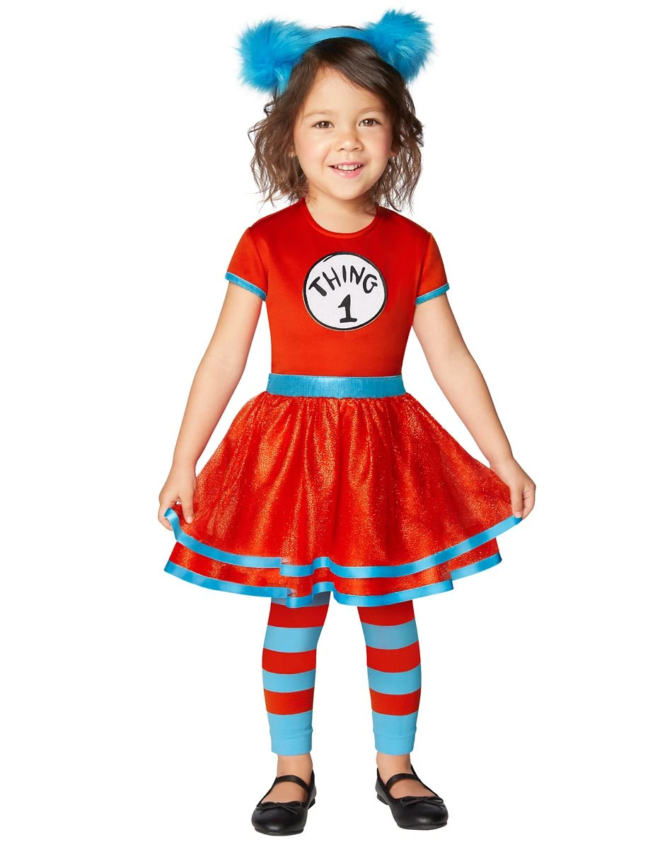 Bring a storybook favorite to life in this Thing 1 and Thing 2 Dr. Seuss costume! This bright red dress features a multi-layer skirt with light blue trim. Blue and red tights, a fluffy blue headband, and adhesive Thing 1 and Thing 2 patches bring this Cat in the Hat classic to completion.