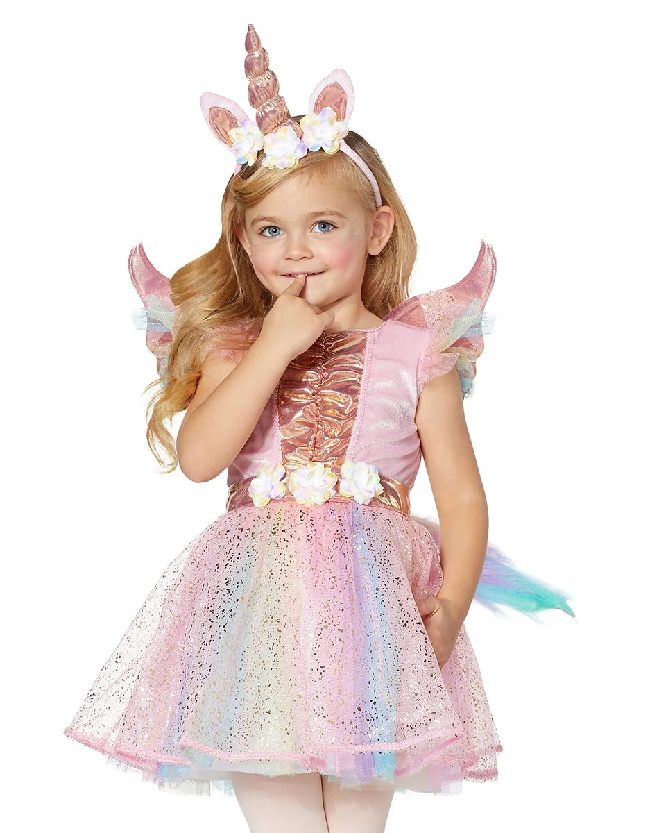 Take flight and get ready for a magical Halloween with this winged unicorn costume! This enchanting costume features a beautiful glittery pink dress with pastel accents, attached wings, and a matching headband adorned with unicorn ears and a horn. Dress up your little one in the costume of their dreams with this fantastical costume, available exclusively at Spirit Halloween!