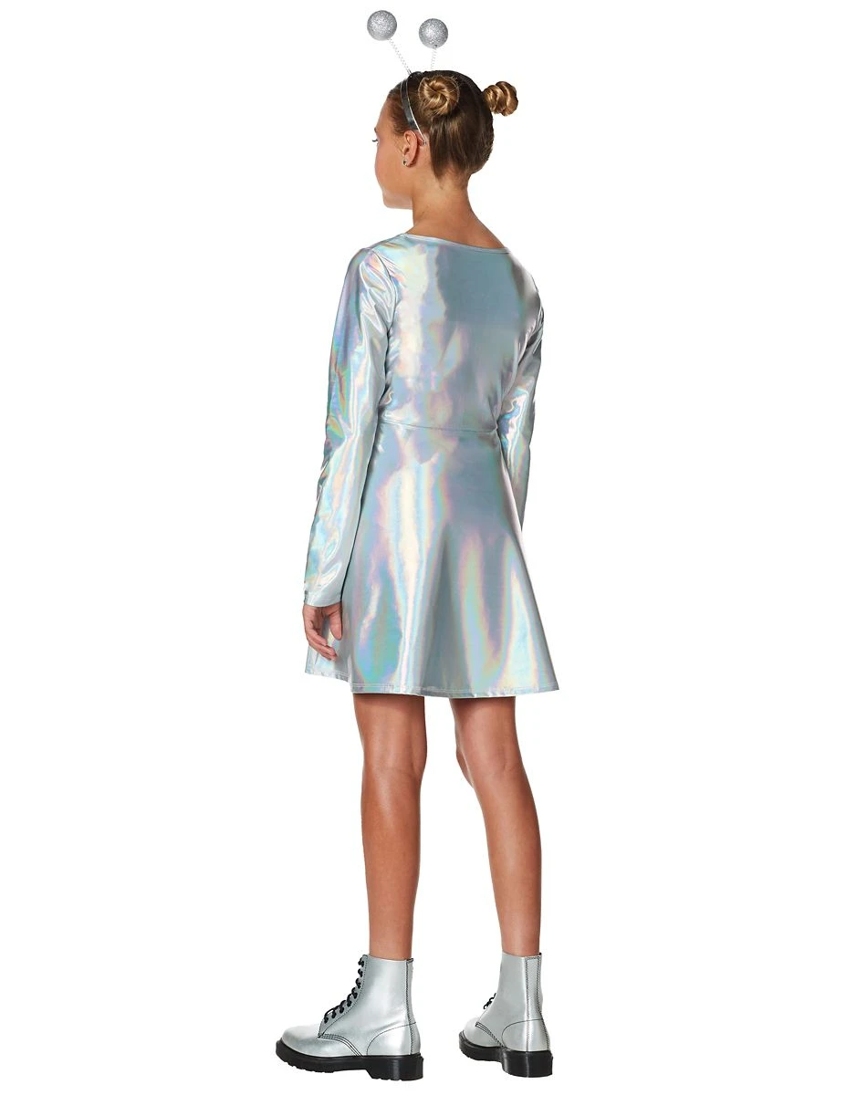 With this tween alien dress you’ll have a Halloween celebration that’s out of this world! This silver dress is reflective so it emits many different rainbow colors and looks great in the light. This silver dress is a terrific option for any space themed party and will definitely have you looking like a space alien when you add a space blaster and antennae (sold separately).