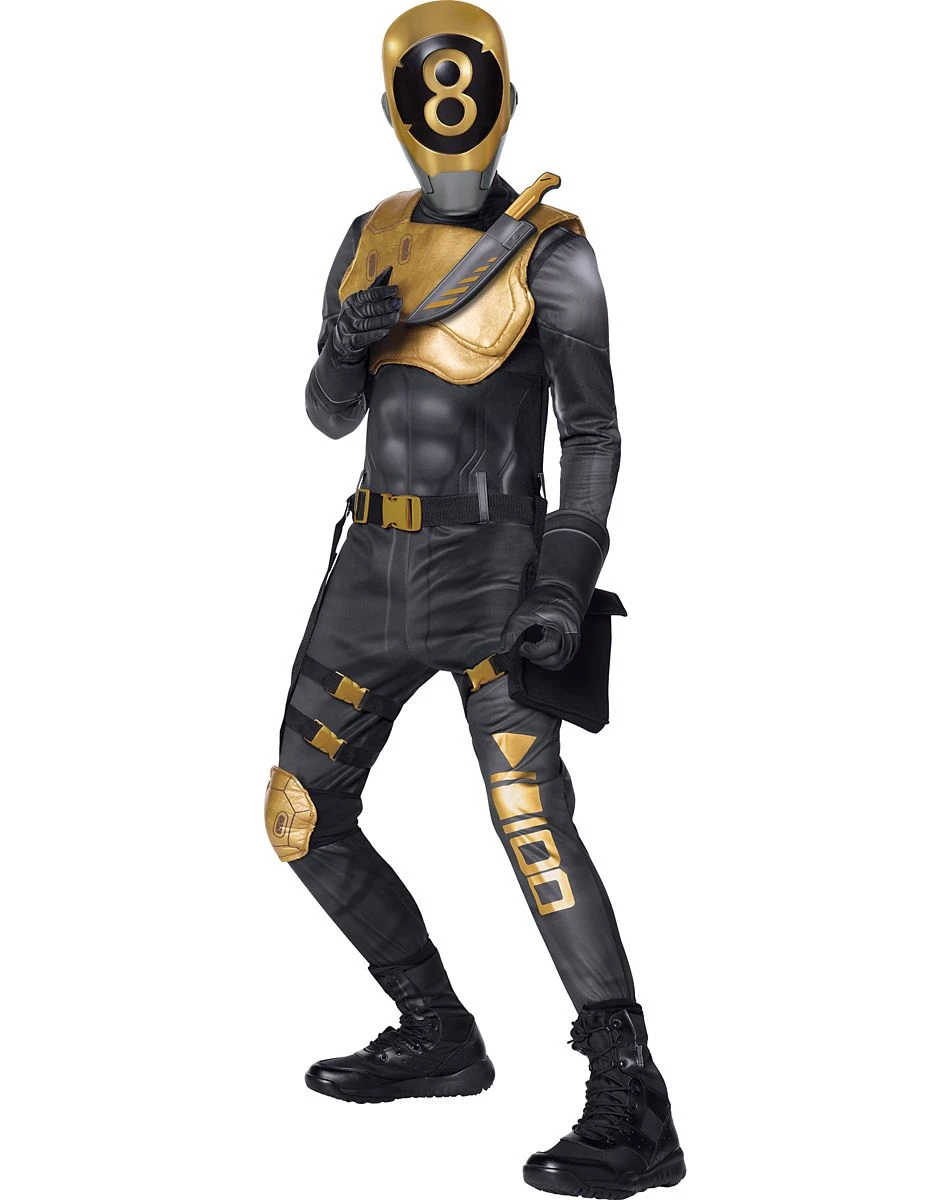 Take your 8-Ball Outfit to the next level this Halloween once you suit up in this officially licensed Fortnite 8-Ball (Gold) Costume. This golden 8-Ball Outfit will have you looking ready for any battle this Halloween. Featuring an awesome 8-Ball jumpsuit, chest armor, and a gold 8-Ball mask to start off your look, once you add the included accessories you’ll be ready to stop anyone who rivals your squad this Halloween.Â