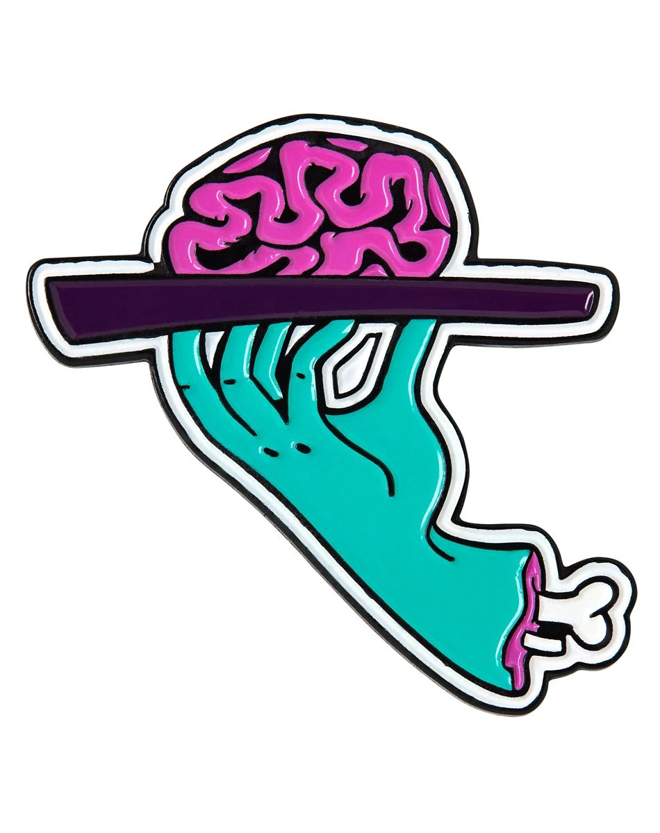 Add some zombie style to your outfit with this set of four pins featuring brains, an eyeball and other zombie-esque images. Use these pins on your jacket, shirt, bag or anywhere else.
